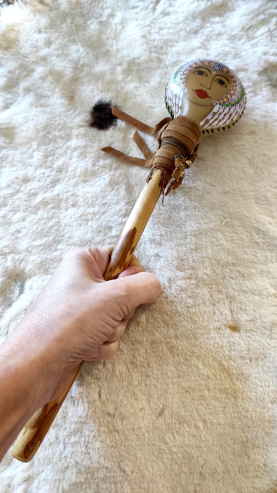 Cada trazo sobre la membrana ha sido pintado a mano, uno a uno, haciendo de esta maraca una pieza artística además de sonora. La unión entre la construcción artesanal y la pintura consciente da como resultado una joya sonora única e irrepetible.